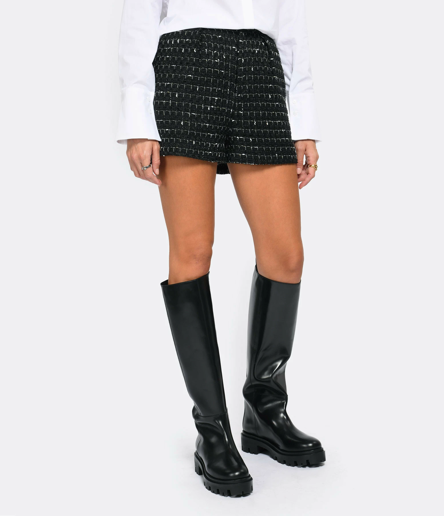 Short taille haute en tweed à carreaux noir et blanc. Fermeture par zip et crochet. Deux poches passepoilées à l’avant et deux poches plaquées à l’arrière. Coupe évasée. Base droite. Doublure en coton et viscose.