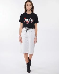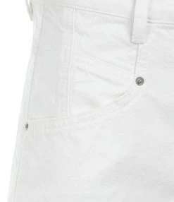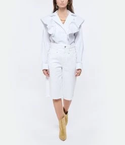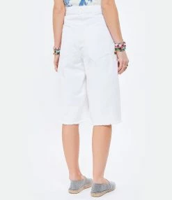 Short long en denim blanc avec bas de jambe effiloché. Taille haute. Fermeture par zip et bouton, passants pour ceinture. Quatre poches.