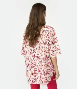 Chemise en coton écru à imprimé multicolore. Manches courtes. Col chemisier. Deux poches à rabats fermées par un bouton. Coupe droite. Base arrondie.