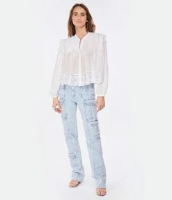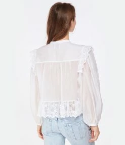 Chemise en coton et soie blanche plissée et ornée de dentelles florales. Col rond. Manches longues bouffantes avec fentes et poignets boutonnés. Fermeture boutonnée sur le devant à patte de boutonnage cachée. Dos froncé. Coupe ample. Base arrondie à dentelles.