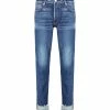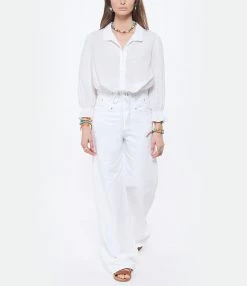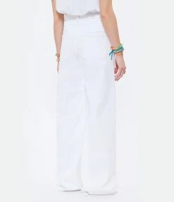 Jean large en denim blanc. Taille haute avec passants pour ceinture. Fermeture par zip et bouton. Deux poches à l’avant et deux poches plaquées à l’arrière. Coupe large.