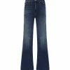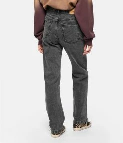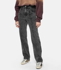 Pantalon en denim de coton gris. Passants pour ceinture. Braguette zippée et bouton métallique argentée. Deux poches italiennes. Deux poches plaquées et jacron dans le dos. Coupe droite. Base droite.