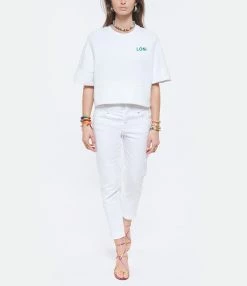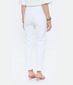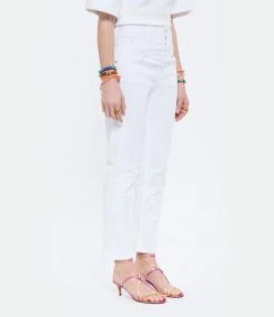 Jean droit blanc. Taille haute. Fermeture boutonnée. Quatre poches. Passants pour ceinture.