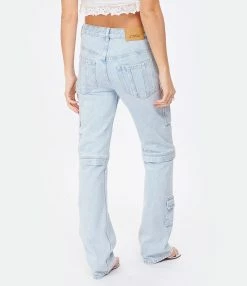 Pantalon en denim de coton bleu clair. Passants pour ceinture. Braguette zippée et bouton métallique argentée. Deux poches plaquées, trois poches à rabat à scratch et une poche passepoilée sur le devant. Deux poches plaquées et une poche à rabat à scratch dans le dos. Coupe droite. Base droite.