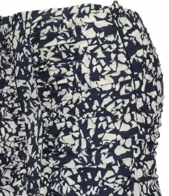 Jupe courte froncée et à volants en soie stretch à imprimé à motifs noir et blanc. Fermeture zippée invisible latérale. Coupe près du corps. Longueur plus courte sur le devant que dans le dos. Base arrondie. Non doublée.