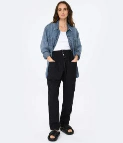 Pantalon cargo en coton noir. Taille élastiquée. Braguette zippée apparente et deux boutons. Deux poches à l’avant. Deux poches à l’arrière zippées. Coupe cargo. Base droite avec zip.