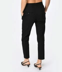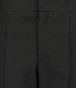 Pantalon tailleur à plis en noir. Braguette zippée et crochet. Deux poches prises dans les coutures latérales sur le devant. Deux poches passepoilées boutonnées dans le dos. Boutons noirs. Coupe droite. Base droite.