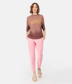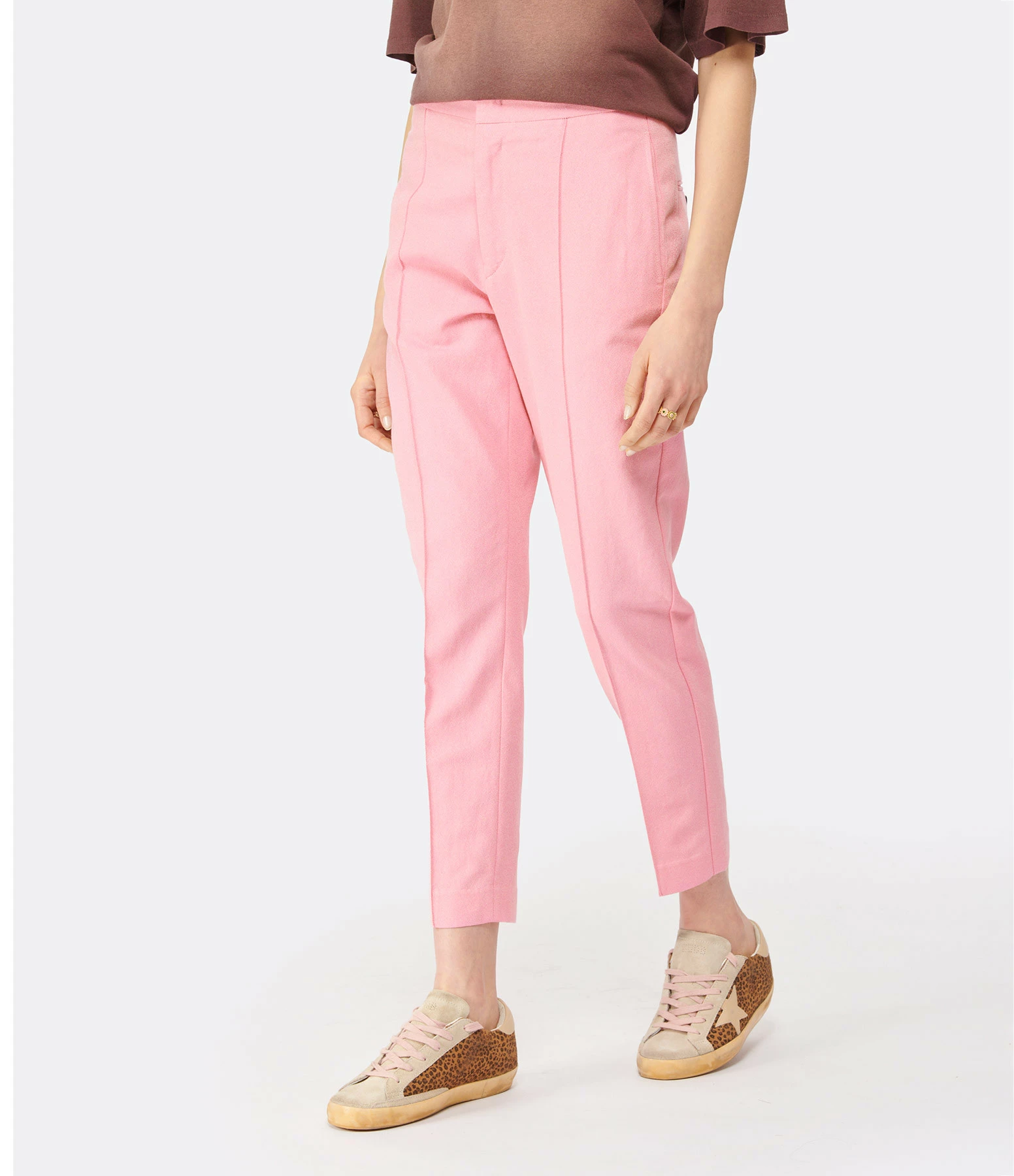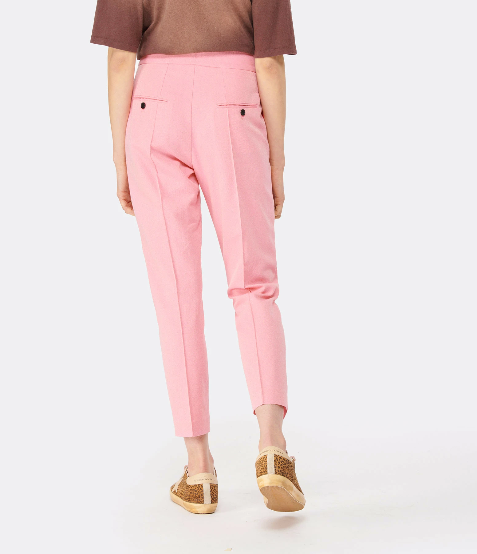 Pantalon tailleur à plis en coton mélangé rose. Braguette zippée et crochet. Deux poches prises dans les coutures latérales sur le devant. Deux poches passepoilées boutonnées dans le dos. Boutons noirs. Coupe droite. Base droite.