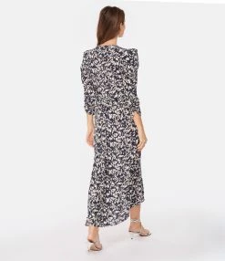 Robe longue en soie stretch à imprimé noir et blanc. Col en V. Manches 7/8 plissées. Épaulettes. Fermeture zippée invisible et à crochet dans le dos. Plissée à l’avant et au dos. Coupe buste cintrée. Coupe jupe évasée. Longueur plus courte sur le devant que dans le dos. Base arrondie. Non doublée.