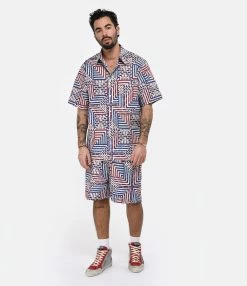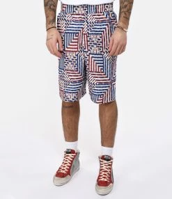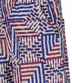 Short matière imperméable à imprimé bleu et bordeaux. Taille élastiquée avec liens de serrage à l’intérieur. Quatre poches. Coupe droite. Base droite.