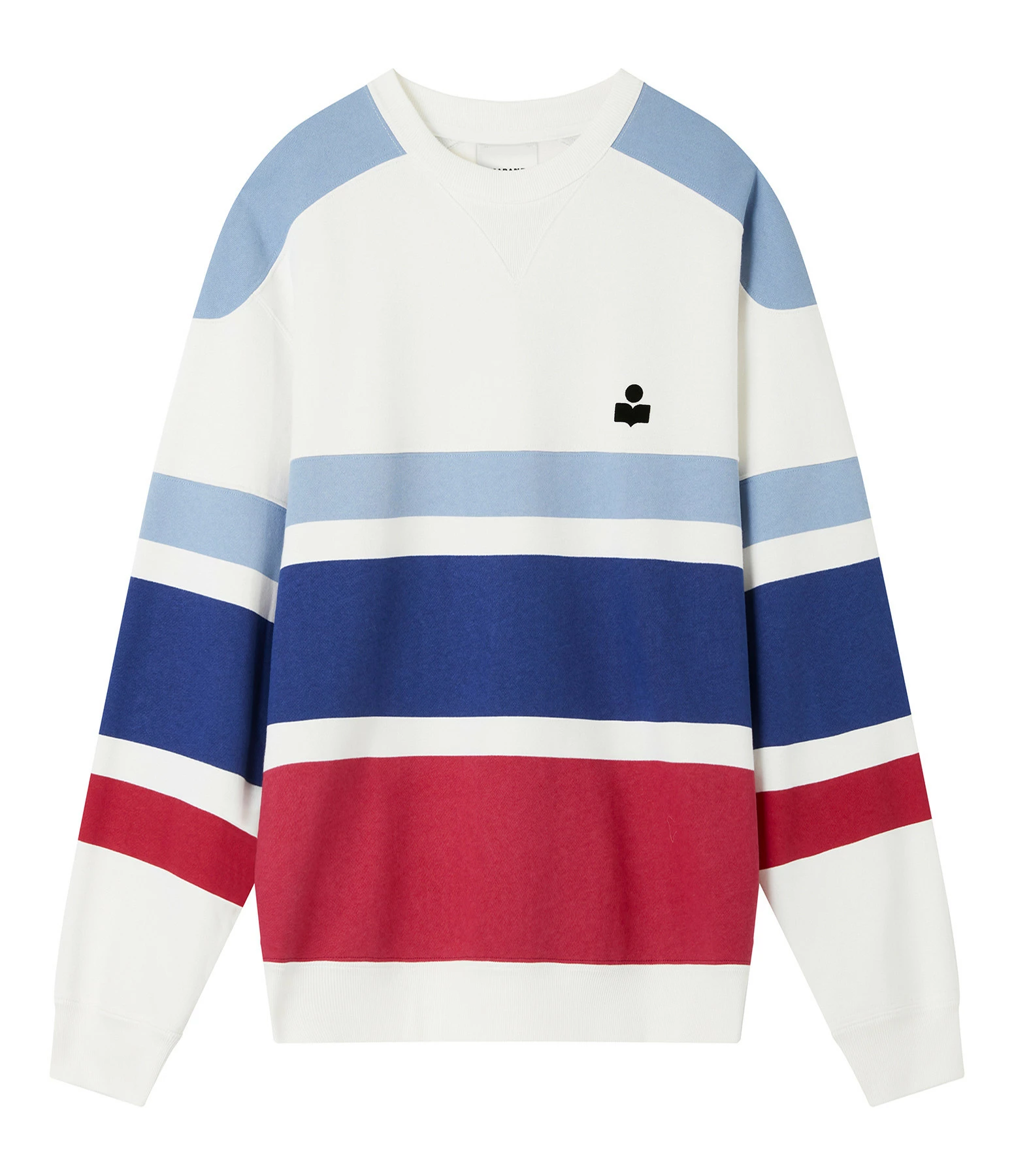 Sweatshirt en coton molletonné mélangé blanc à rayures bleu et bordeaux avec le logo flocké en velours noir sur la poitrine. Col rond côtelée. Manches longues avec poignets côtelés. Coupe ample. Base droite côtelée.