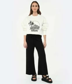 Sweatshirt en coton blanc avec imprimé en noir sur le devant. Col rond. Manches longues. Coupe droite. Base droite.