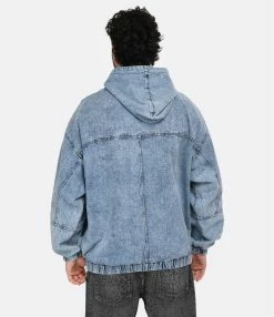 Sweatshirt en denim de coton bleu délavé. Coutures soulignées par un surjet bleu foncé. Col à capuche avec cordon de serrage et fermeture zippée. Manches longues avec poignets élastiqués. Poche kangourou. Taille élastiquée.