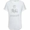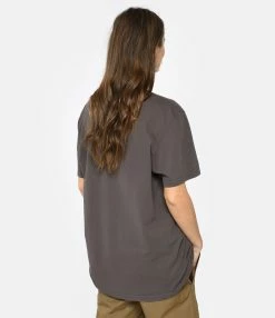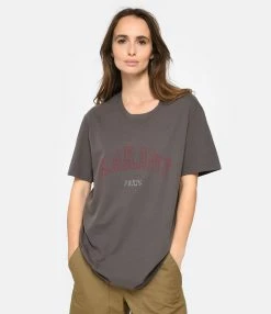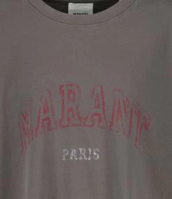 Tee-shirt en coton gris foncé avec l’inscription “Marant Paris” imprimée en rouge et blanc avec un effet usé et effacé sur le devant. Col rond côtelé. Manches courtes. Coupe droite. Base droite.