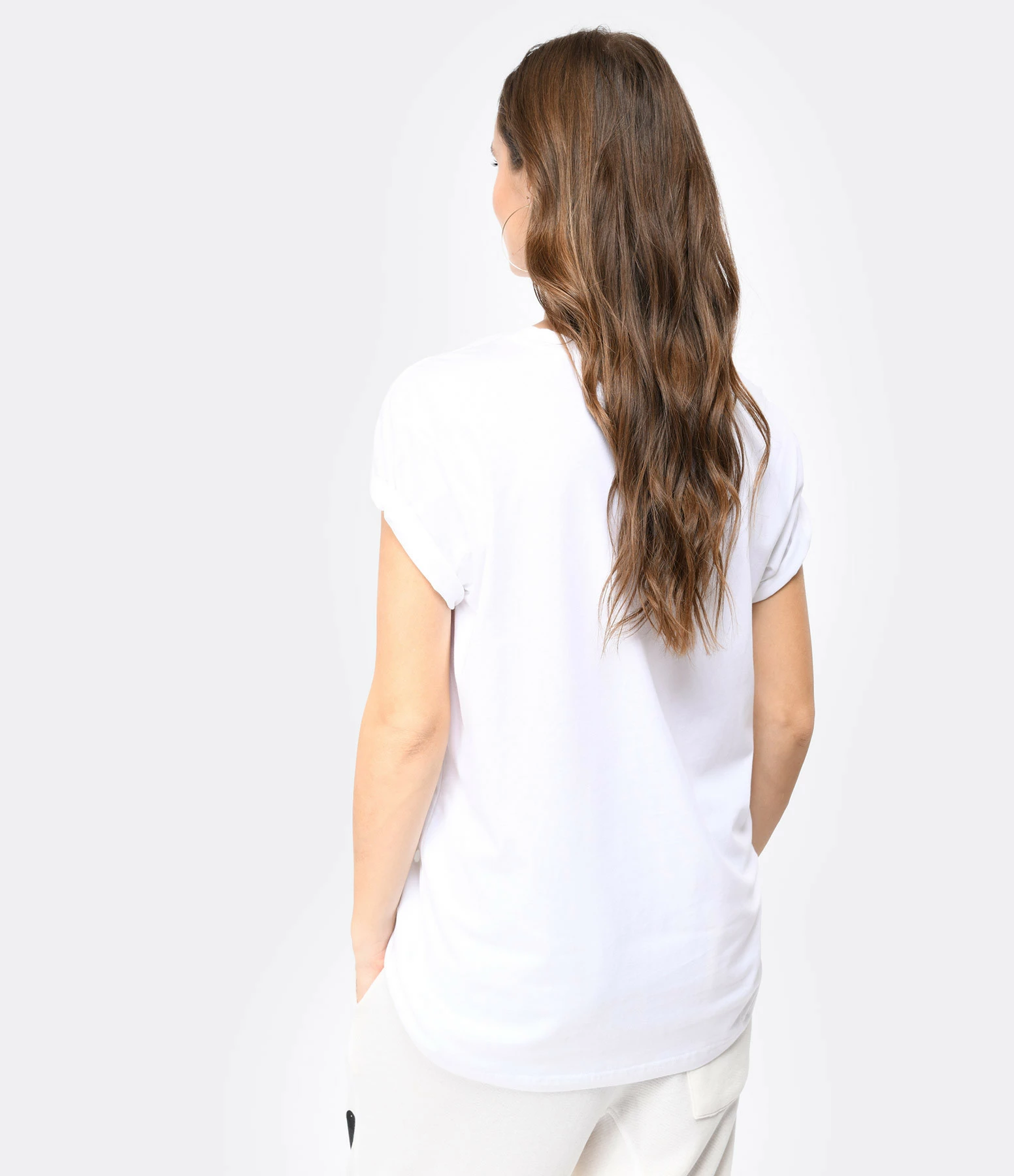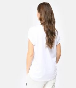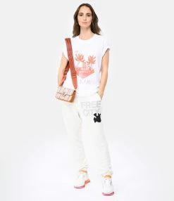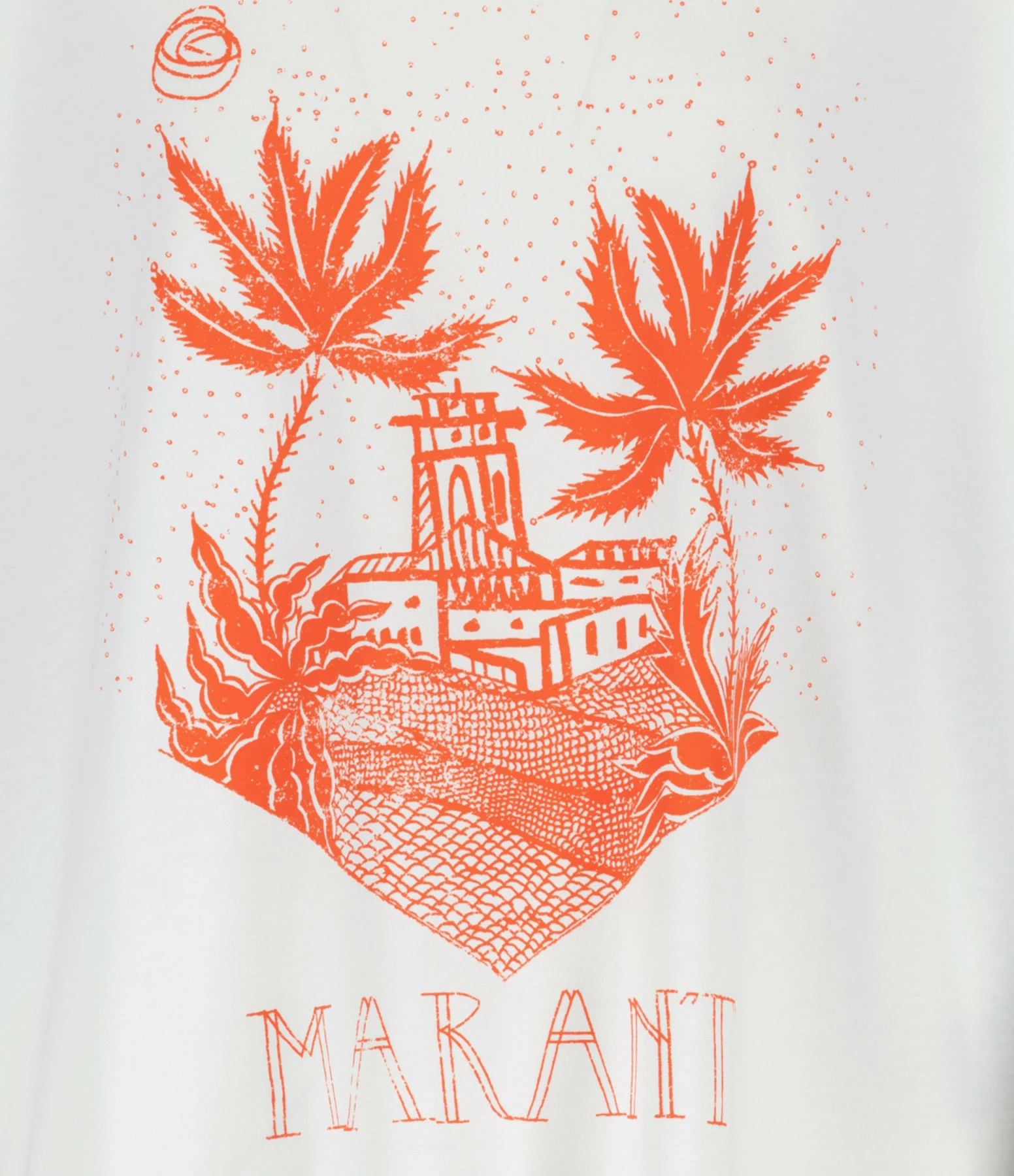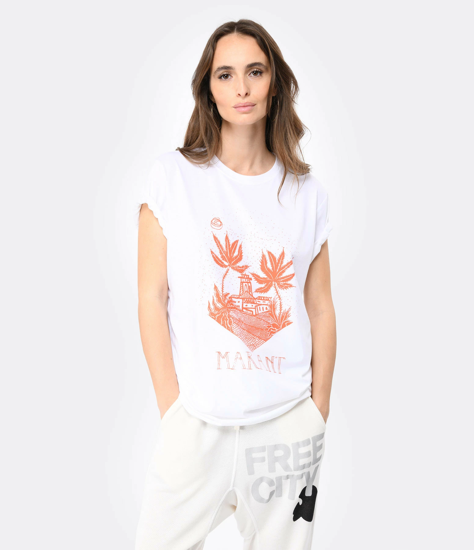 Tee-shirt en coton blanc avec imprimé en orange à l’avant. Col rond côtelé. Manches courtes. Coupe droite. Base droite.