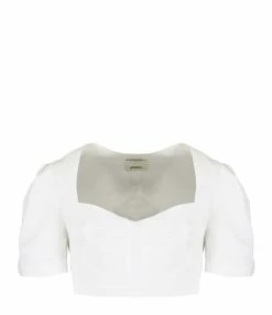 Top court blanc à manches courtes. Effet bouffant aux épaules. Décolleté en cœur. Fermeture invisible latérale.