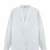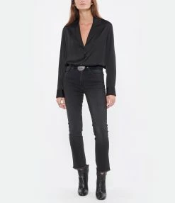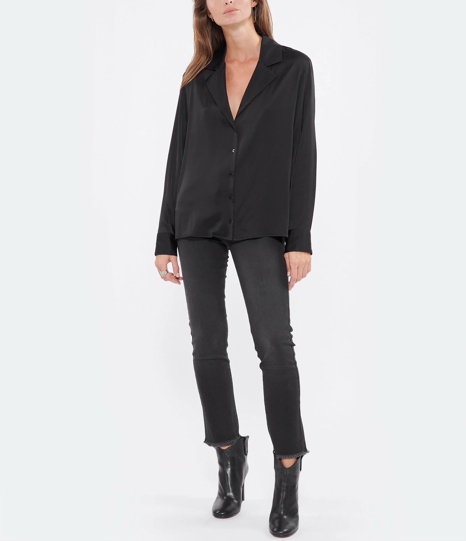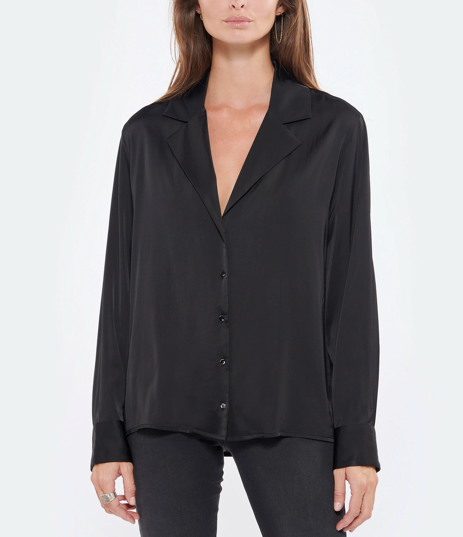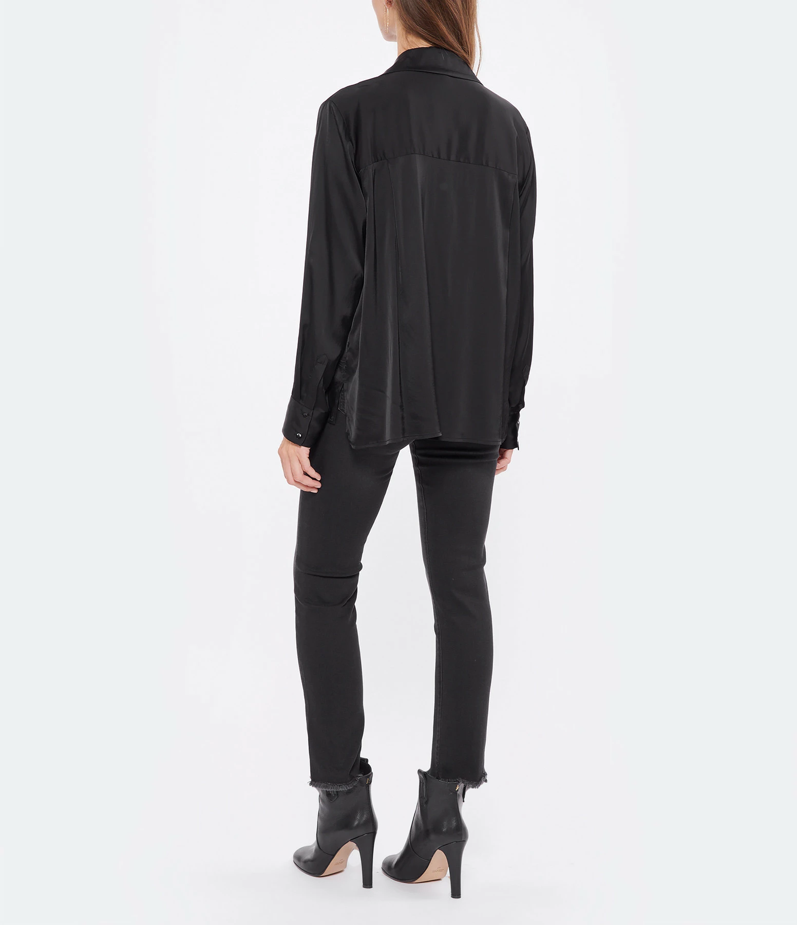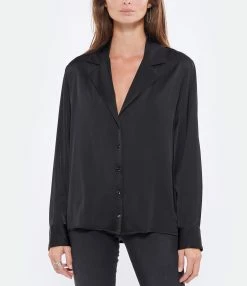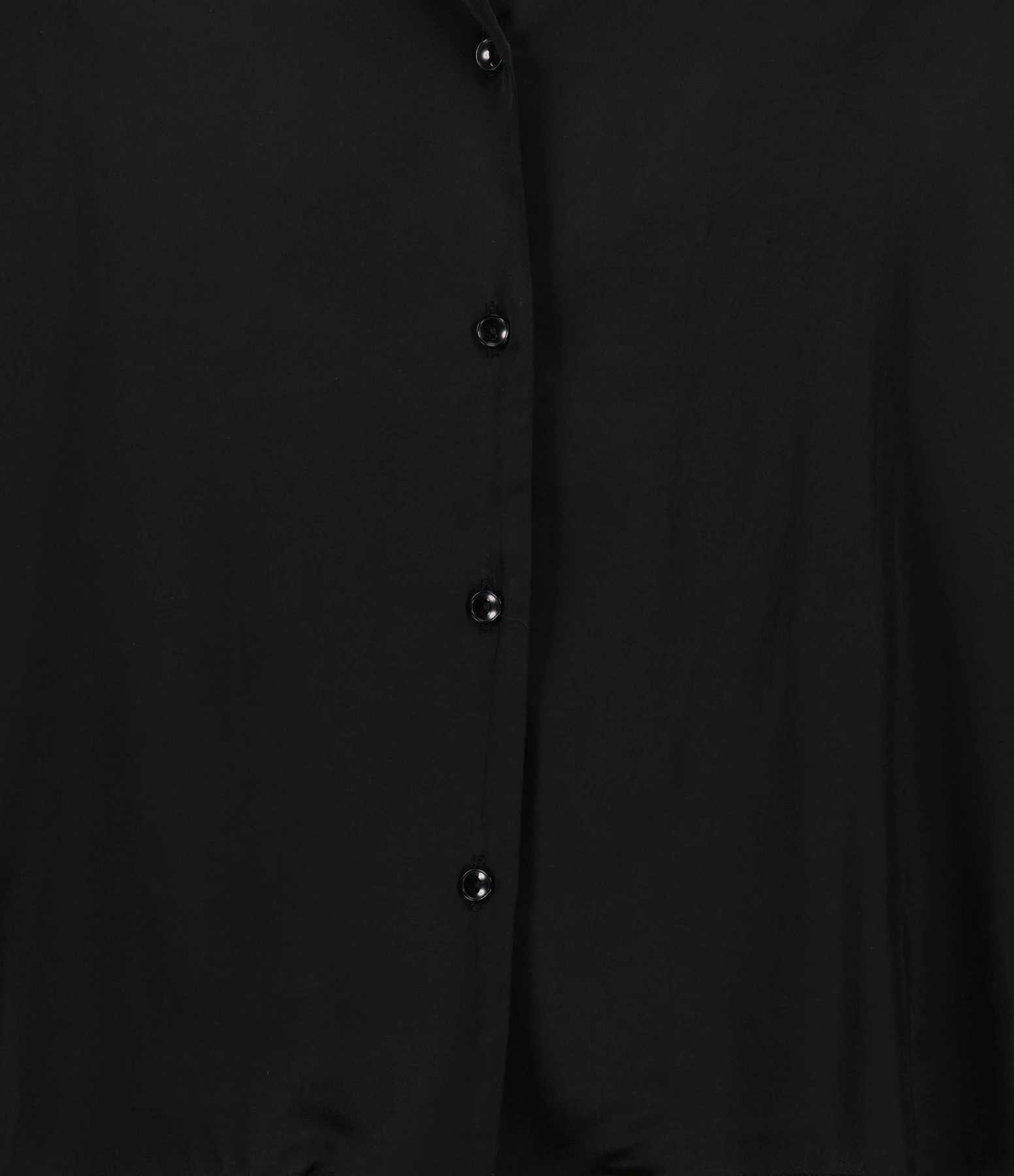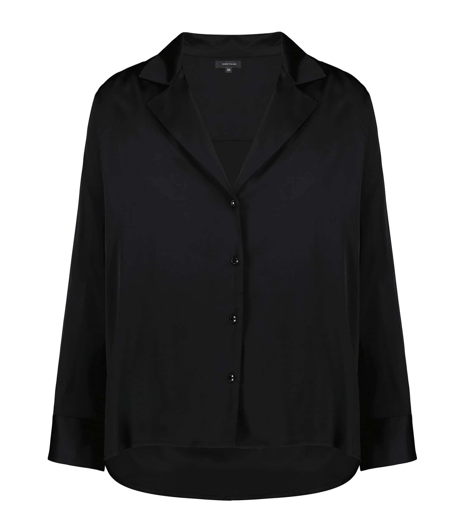 Chemise en satin noir. Col chemise. Manches longues. Fermeture par boutons. Coupe large. Base arrondie plus longue à l’arrière.