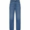 Pantalon en denim bleu clair délavé. Coupe flare. Cinq poches. Fermeture par zip et bouton gravé Jeanne Vouland. Coupé à cru en bas de jambe. Coupe flare, évasée sur le bas.