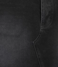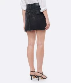 Jupe courte en denim noir délavé à abrasions et effets usés par endroits. Fermeture par boutons. Cinq poches. Coupe droite. Base asymétrique, effilochée et coupée à cru. Non doublée.