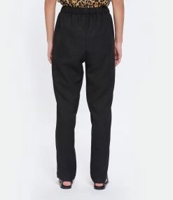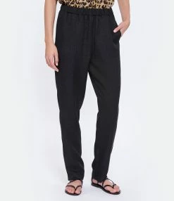Pantalon cigarette effet lin noir. Taille haute élastiquée avec passants. Poches latérales dans les coutures. Coupe fuselé.