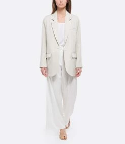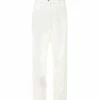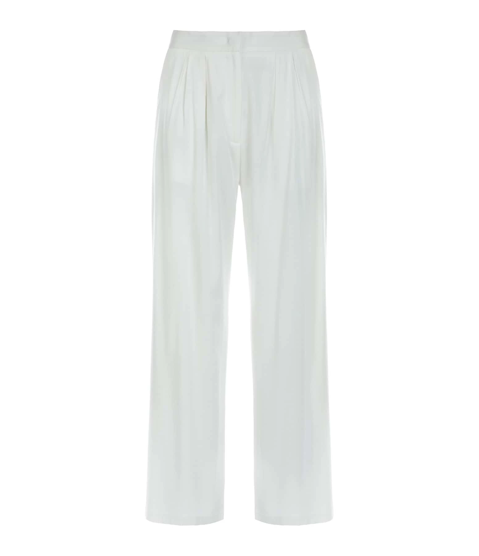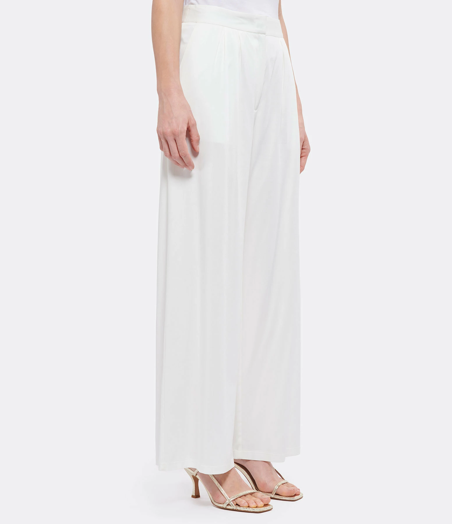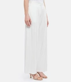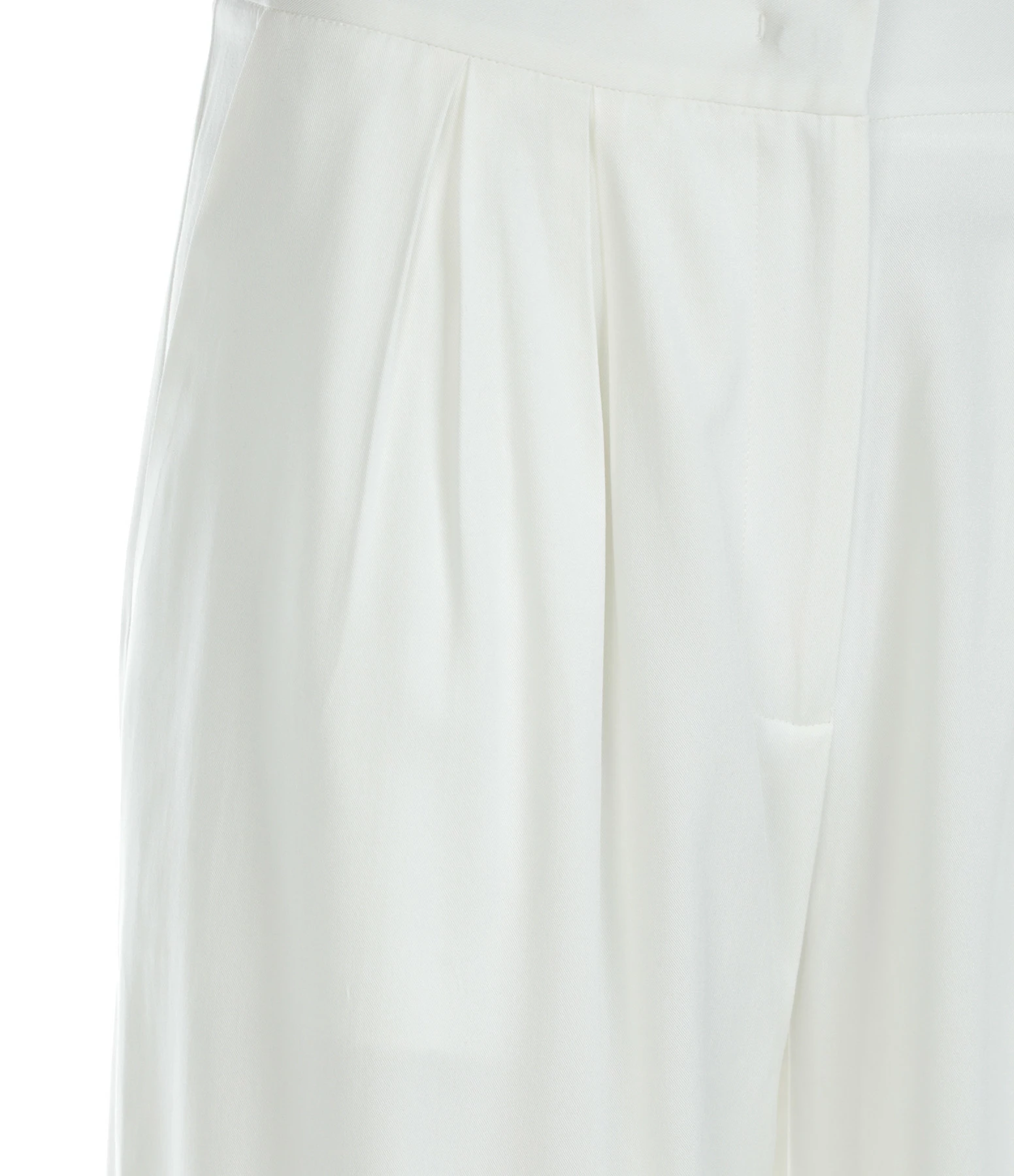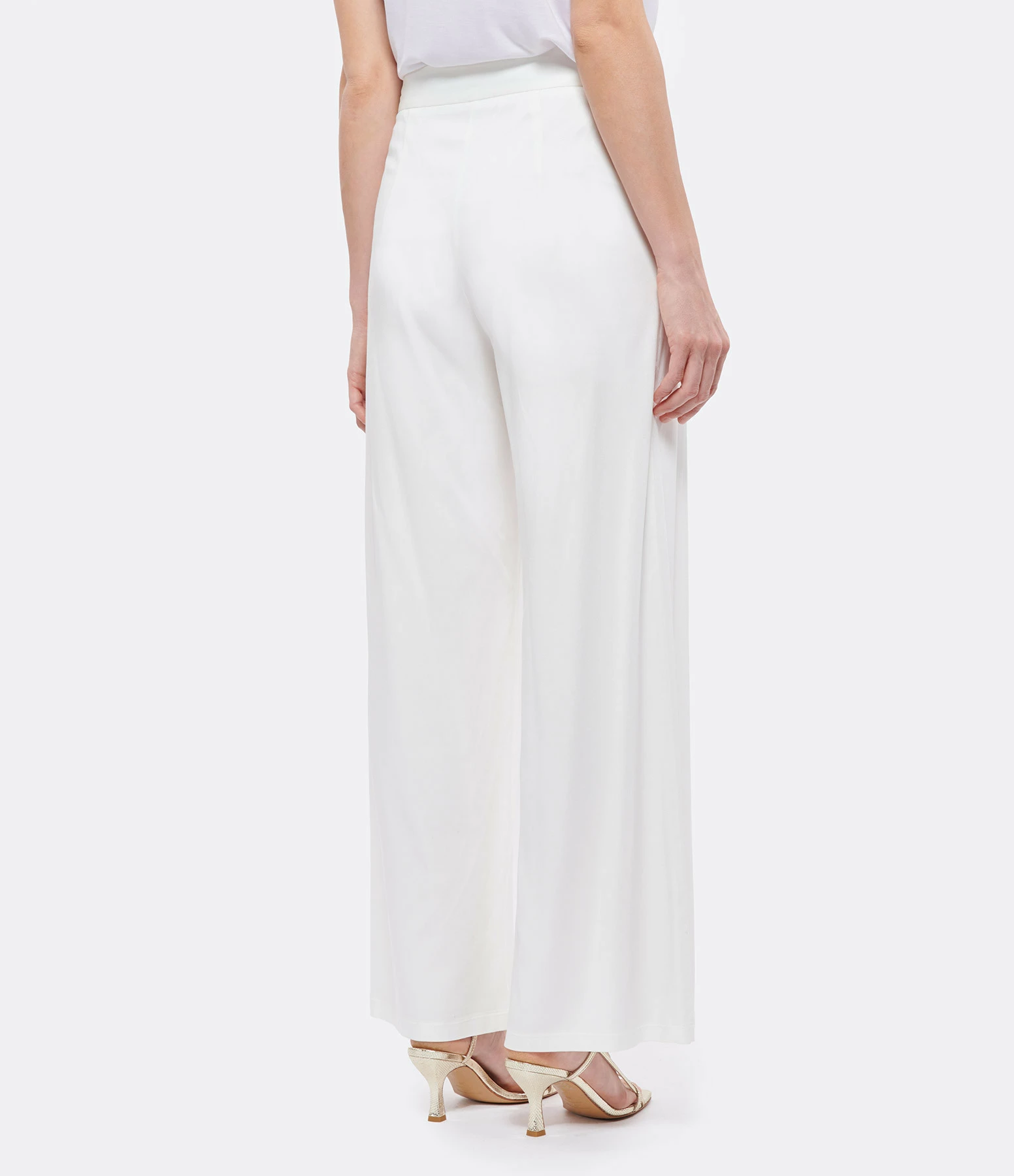 Pantalon palazzo à pinces écru. Fermeture par zip, agrafes et bouton. Poches latérales. Couple ample et évasée.