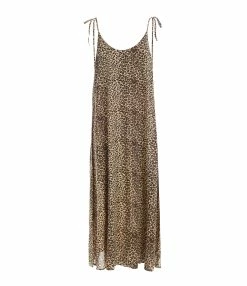 Robe longue à imprimé léopard. Col rond et décolleté dans le dos. Liens à nouer aux épaules. Fente de 32 cm à droite. Coupe ample. Base droite. Non doublée.