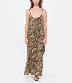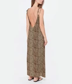 Robe longue à imprimé léopard. Col rond et décolleté dans le dos. Liens à nouer aux épaules. Fente de 32 cm à droite. Coupe ample. Base droite. Non doublée.