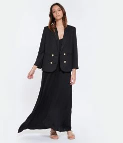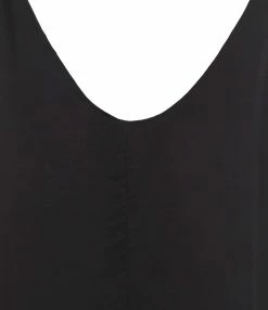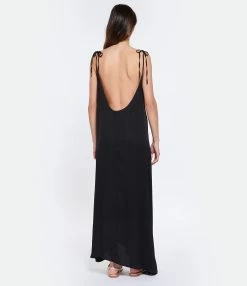 Robe longue satinée noire. Col rond et décolleté dans le dos. Liens à nouer aux épaules. Fente de 32 cm à droite. Coupe ample. Base droite. Non doublée.