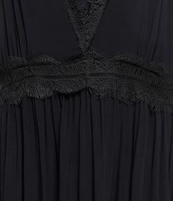 Robe longue noir. Col en V devant et dos. Détails dentelle ajourée sur l’encolure et la taille. Légèrement transparente et asymétrique. Sans manches. Non doublée.
