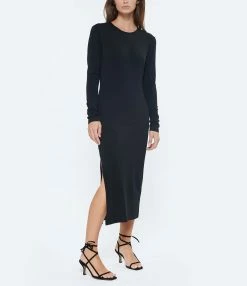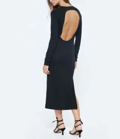 Robe midi en coton noir. Col rond. Dos ouvert dans une découpe arrondi. Manches longues. Une fente latérale. Coupe près du corps. Base droite. Non doublée.