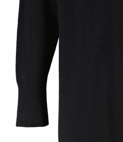 Robe pull longue en laine et cachemire noire. Manches longues. Col V avec revers style polo. Fendue sur le côté gauche au niveau du genou. Base droite.