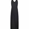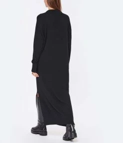 Robe pull longue en laine et cachemire noire. Manches longues. Col V avec revers style polo. Fendue sur le côté gauche au niveau du genou. Base droite.