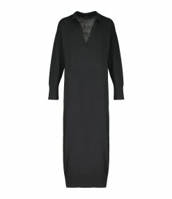 Robe pull longue en laine et cachemire noire. Manches longues. Col V avec revers style polo. Fendue sur le côté gauche au niveau du genou. Base droite.
