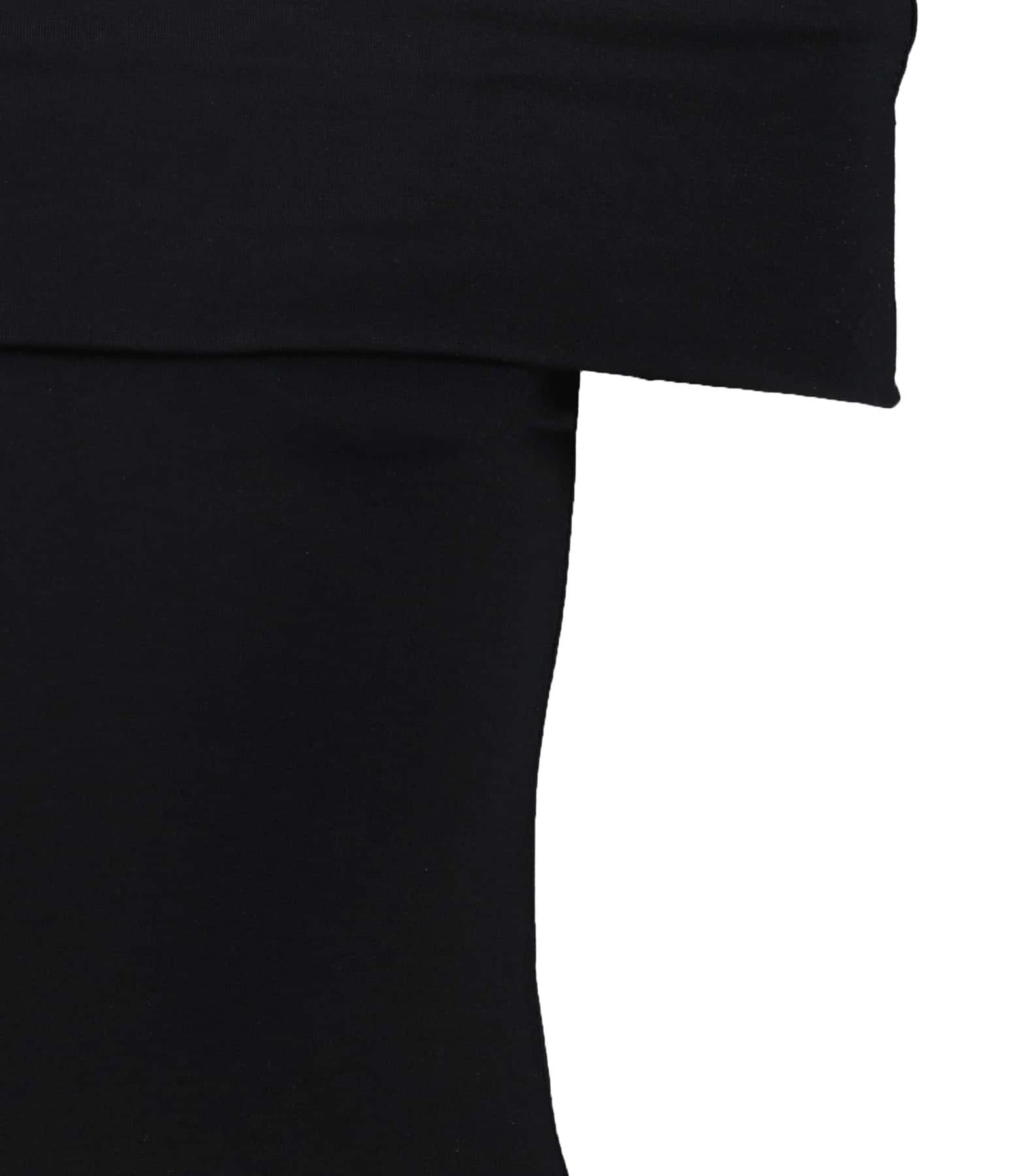 Robe longue noire col bardot. Coupe droite. Base droite avec fentes de 40 cm sur le côté gauche.