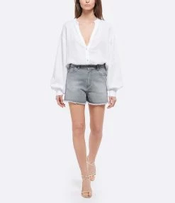 Short en denim gris. Taille haute avec passants pour ceinture. Fermeture par zip et bouton. Cinq poches. Bords frangés. Coupe droite.