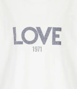 Tee-shirt blanc en coton. Inscription “LOVE 1971” flockée en paillettes argentées sur le devant. Col rond. Manches courtes. Coupe droite. Base droite.