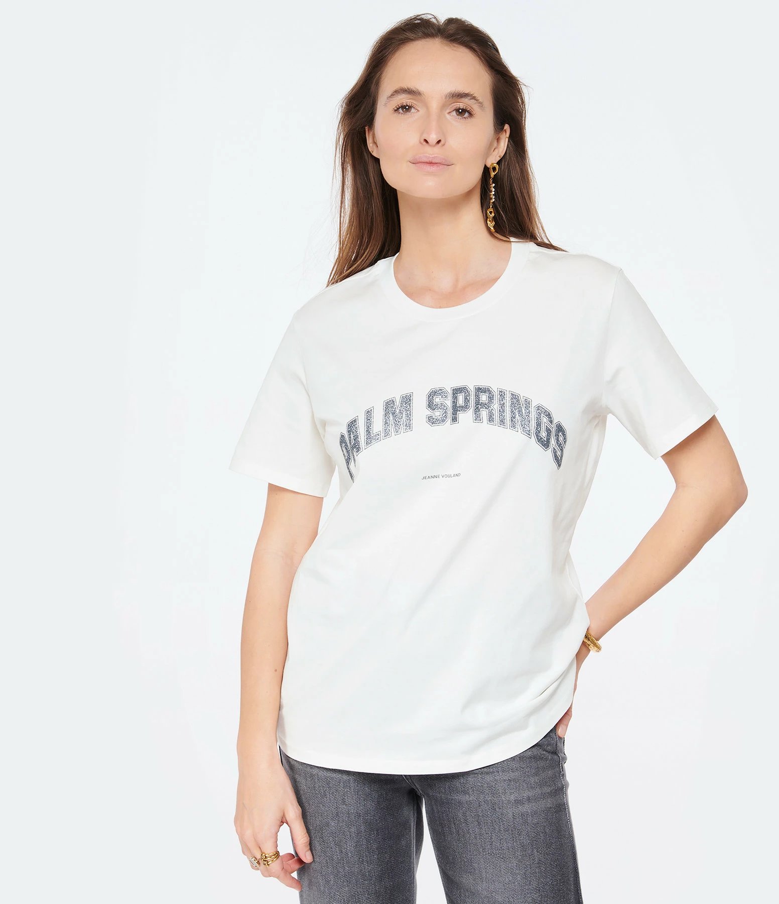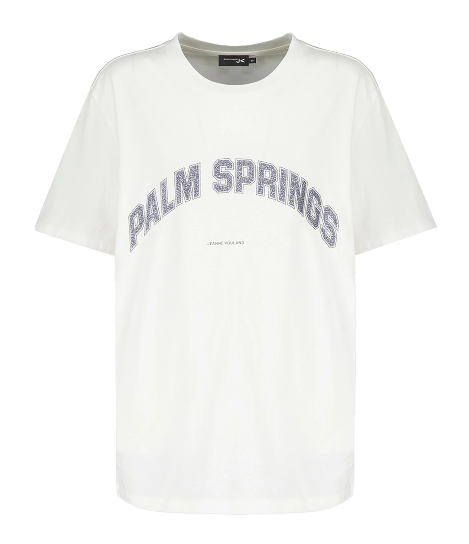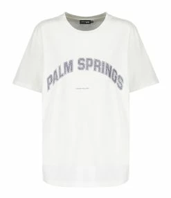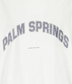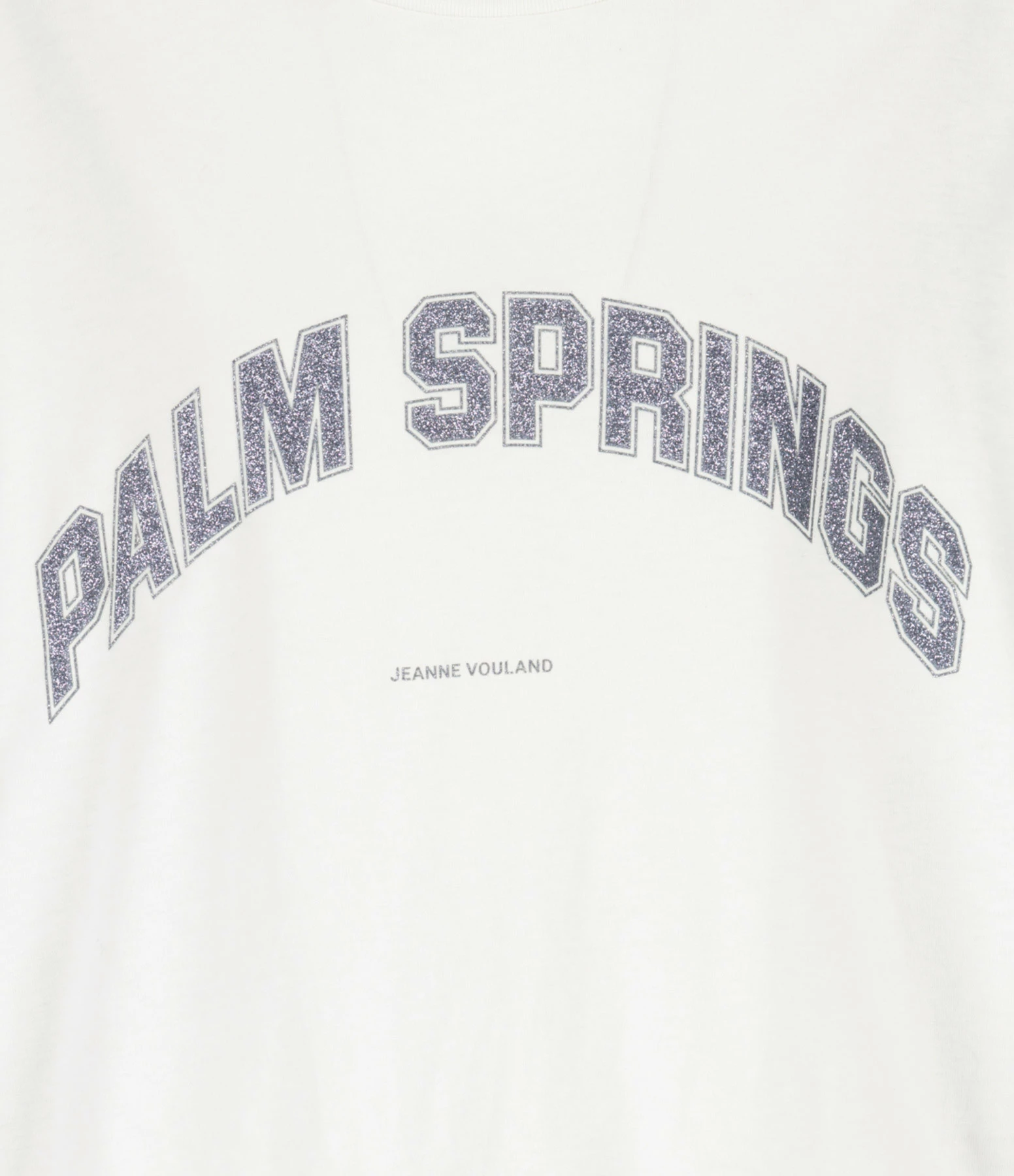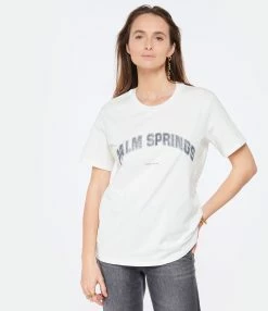Tee-shirt blanc en coton biologique. Inscription “PALM SPRINGS” flockée en paillettes argentées sur le devant. Col rond. Manches courtes. Coupe droite. Base droite.