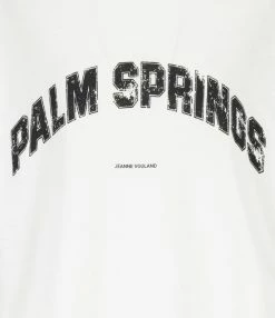Tee-shirt blanc en coton biologique. Inscription “PALM SPRINGS” flockée en noir sur le devant. Col rond. Manches courtes. Coupe droite. Base droite.