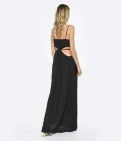 Robe longue noire. Col carré. Sans manches. Fines bretelles. Fermeture zippée invisible dans le dos. Jeu de découpes au niveau de la taille froncée avec liens à nouer dans le dos. Deux poches prises dans les coutures latérales. Coupe buste près du corps. Coupe jupe évasée. Base droite. Doublée.