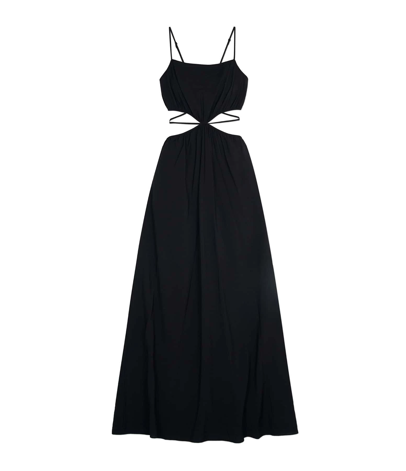 Robe longue noire. Col carré. Sans manches. Fines bretelles. Fermeture zippée invisible dans le dos. Jeu de découpes au niveau de la taille froncée avec liens à nouer dans le dos. Deux poches prises dans les coutures latérales. Coupe buste près du corps. Coupe jupe évasée. Base droite. Doublée.
