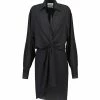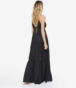 Robe longue à panneaux froncés en coton noir. Décolleté profond en V avec un jeu de découpe. Dos échancré en V avec liens à nouer. Sans manches. Fines bretelles. Deux poches prises dans les coutures latérales. Cordons de serrage à nouer au niveau des coutures latérales. Coupe large. Base droite.