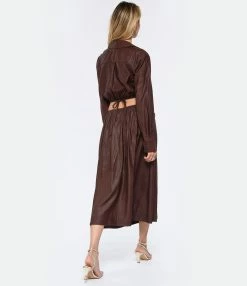 Crop top en satin marron se démarquant par un anneau métallique doré sur le devant. Col chemise avec décolleté en V. Manches longues avec fentes et poignets boutonnés. Pli creux dans le dos. Coupe droite. Longueur raccourcie. Base droite élastiquée et froncée dans le dos avec liens de serrage sur le devant.