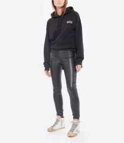 Pantalon legging en cuir noir. Taille haute élastiquée. Coupe skinny. Base droite avec bords francs.
