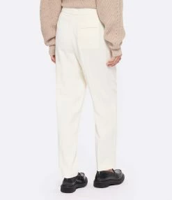 Pantalon tailleur à pinces ivoire. Fermeture zippée et à crochet latérale. Deux poches italiennes sur le devant. Une poche passepoilée dans le dos. Coupe droite. Base droite.