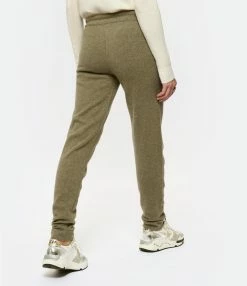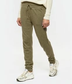 Jogging en cachemire kaki chiné. Taille élastiquée et liens de serrage. Deux poches italiennes. Coupe slim.