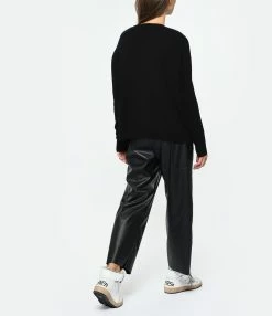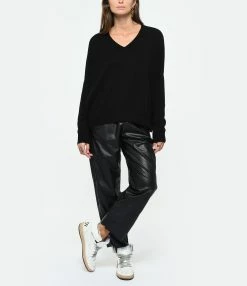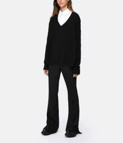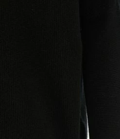 Pull en tricot jersey de cachemire noir. Col en V côtelé. Manches longues avec poignets côtelés. Fentes latérales. Coupe oversize. Base droite côtelée.