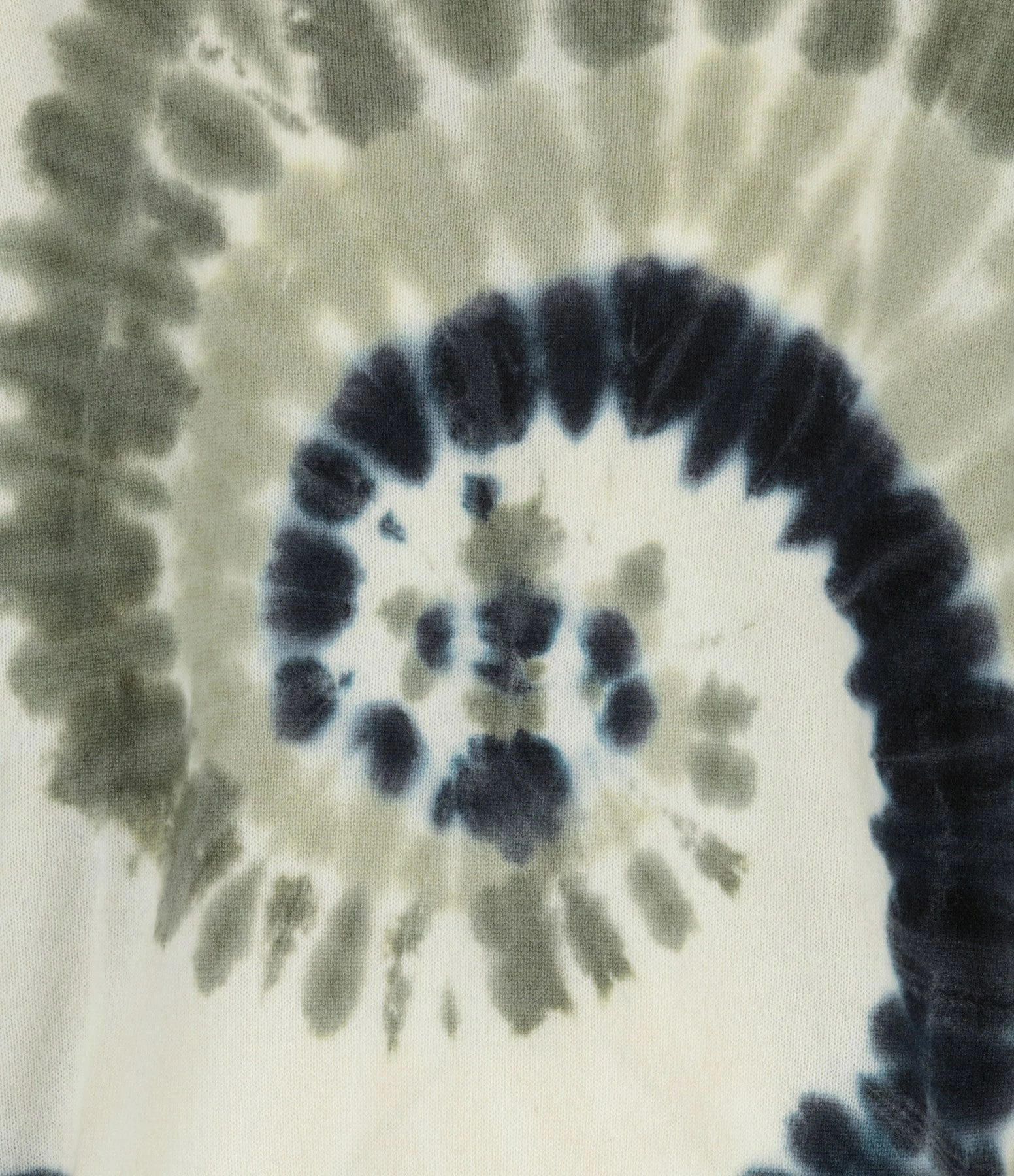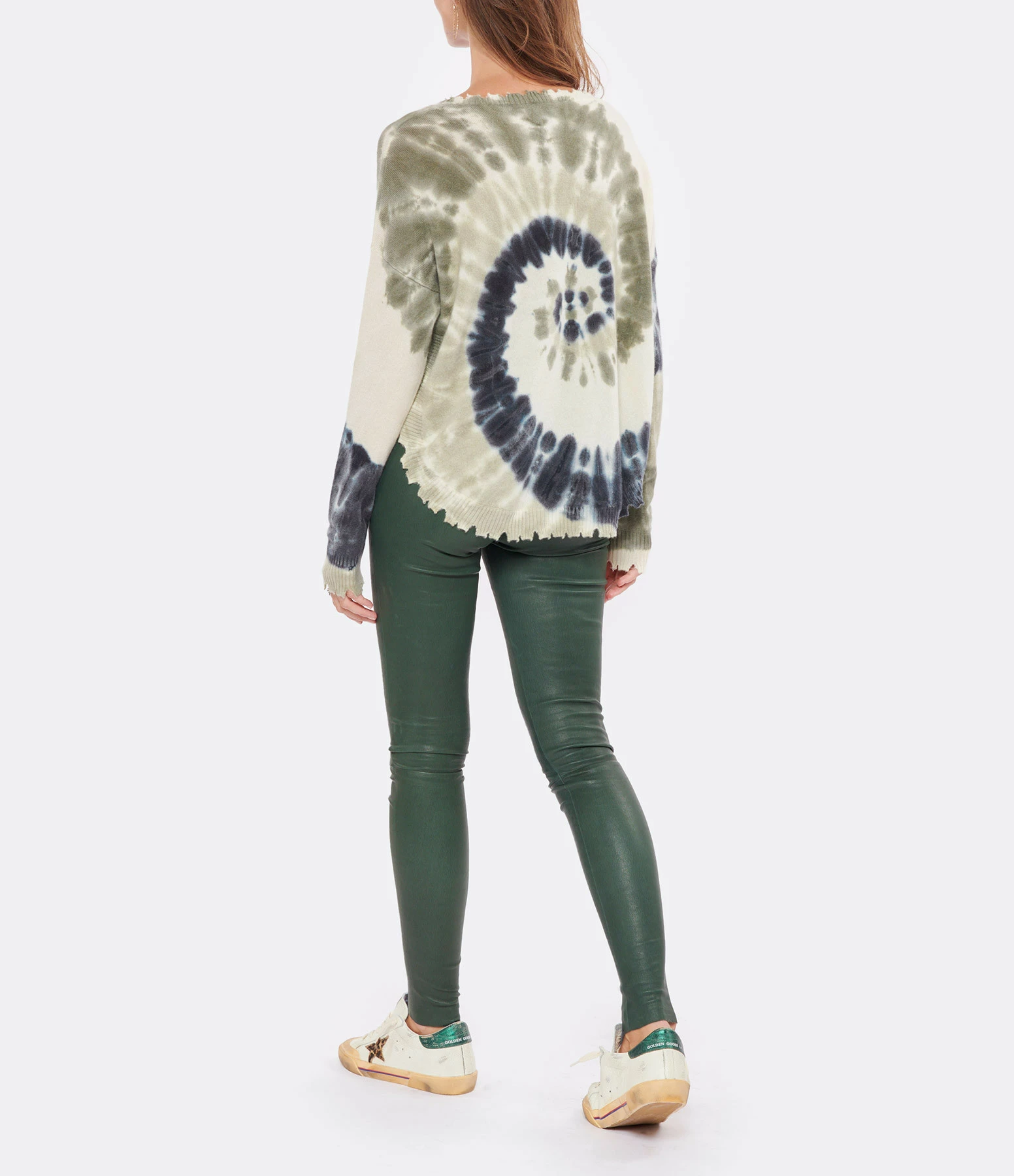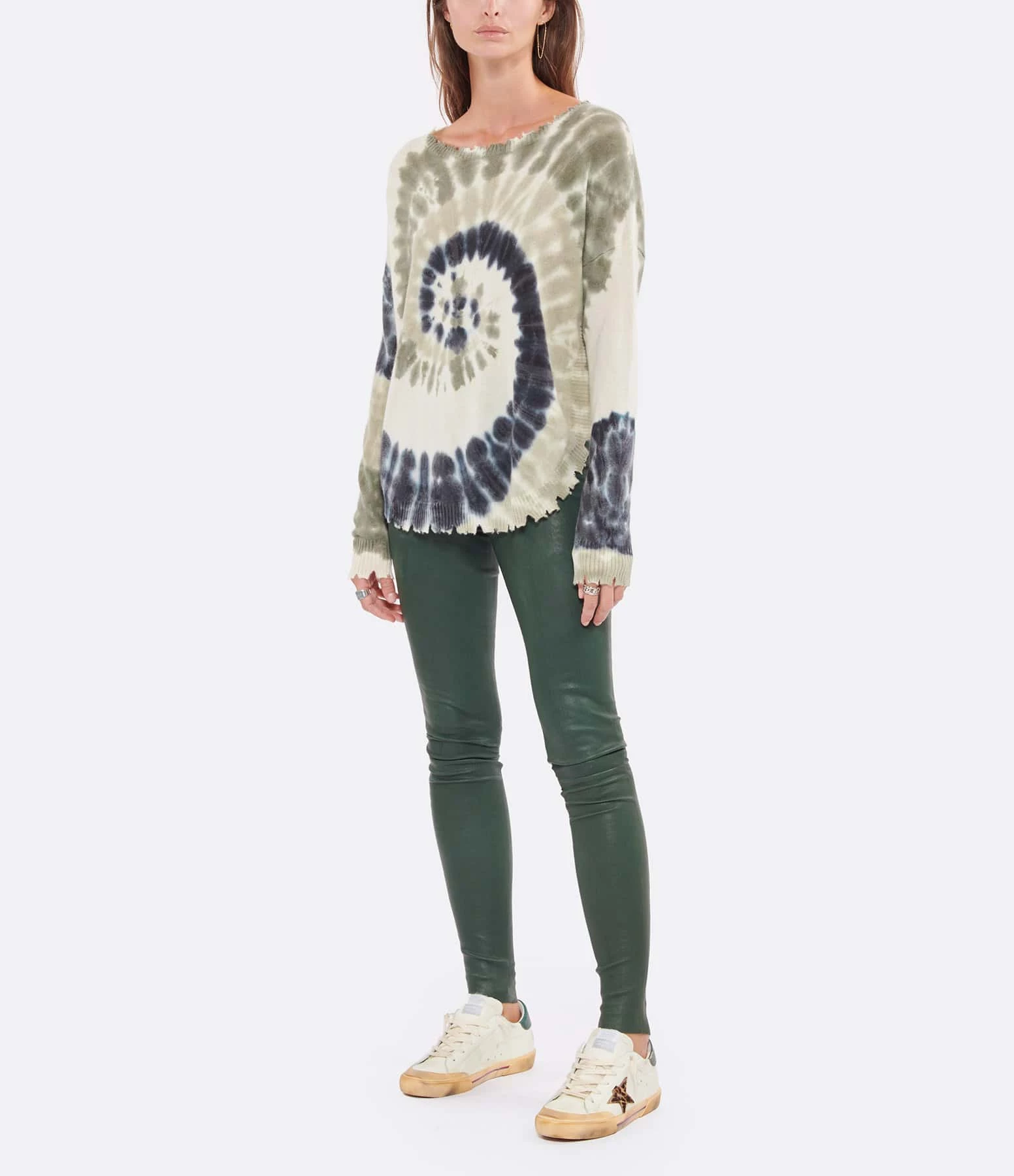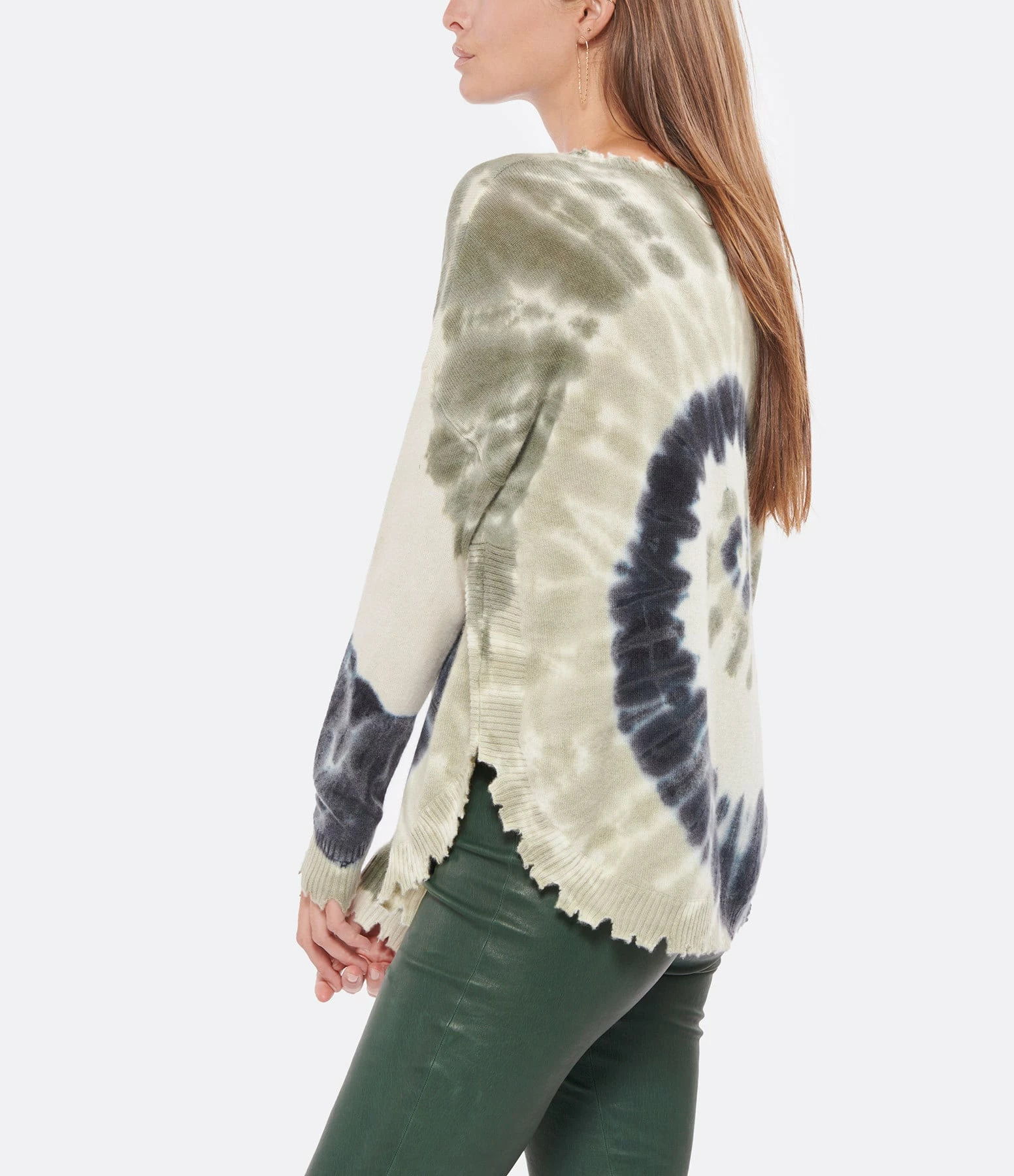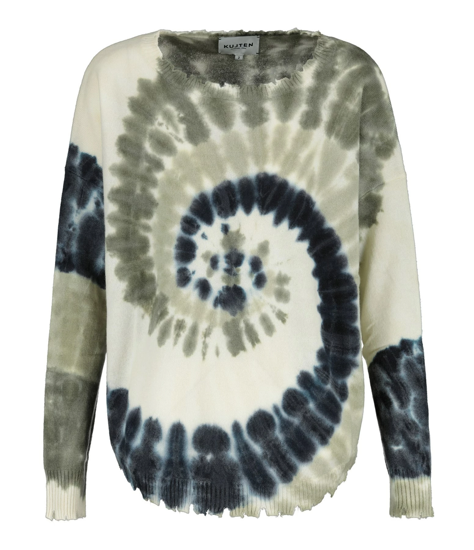 Pull en cachemire kaki imprimé motif psychédélique. Encolure bateau effet déchiré. Manches longues effet déchiré. Coupe droite. Base droite avec ourlet effet déchiré.