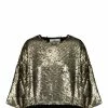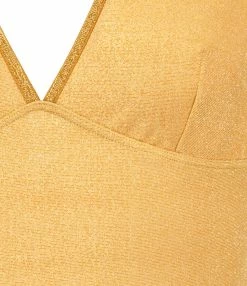 Top en lurex pailleté doré. Décolleté en V plongeant orné d’un liseré doré pailleté. Échancré dans le dos. Sans manches. Bretelles. Élastique de maintien sous la poitrine pour plus de confort. Coupe près du corps. Base droite.
