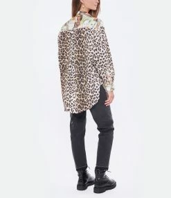 Chemise oversize à imprimé léopard avec détails en soie à imprimé multicolore. Fermeture boutonnée. Col chemise. Manches longues. Une poche plaquée sur la poitrine. Coupe ample. Base arrondie, plus longue à l’arrière.