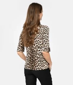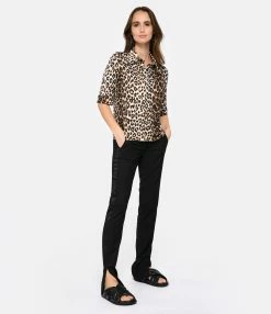 Chemise en tissu stretch à imprimé léopard. Col chemisier. Manches courtes avec bords rabattus. Fermeture boutonnée sur le devant. Coupe droite. Base droite.